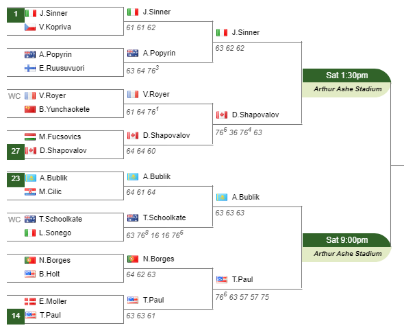 - Adrian MannarinoMannarino – Ben SheltonShelton (3-6 6-3 4-6 6-4 ret.)