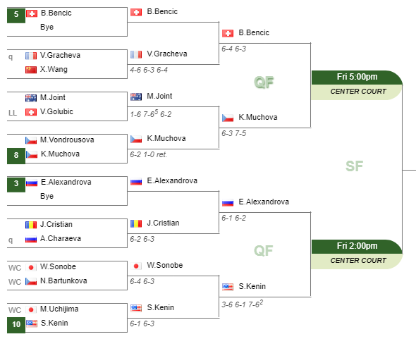 Sofia Kenin will face the world no.10 Ekaterina Alexandrova in the quarter on Friday at 2:00 pm on CENTER COURT. Their head to head is 1-0 for Alexandrova.