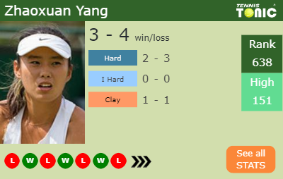 Zhaoxuan has a 3-4 win-loss record in 2019, 2-3 on hard (See FULL STATS).