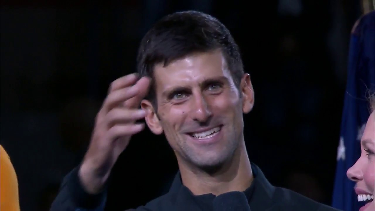 Roger Federer receives his trophy and addresses the audience following his Australian Open 2017 men`s singles final.