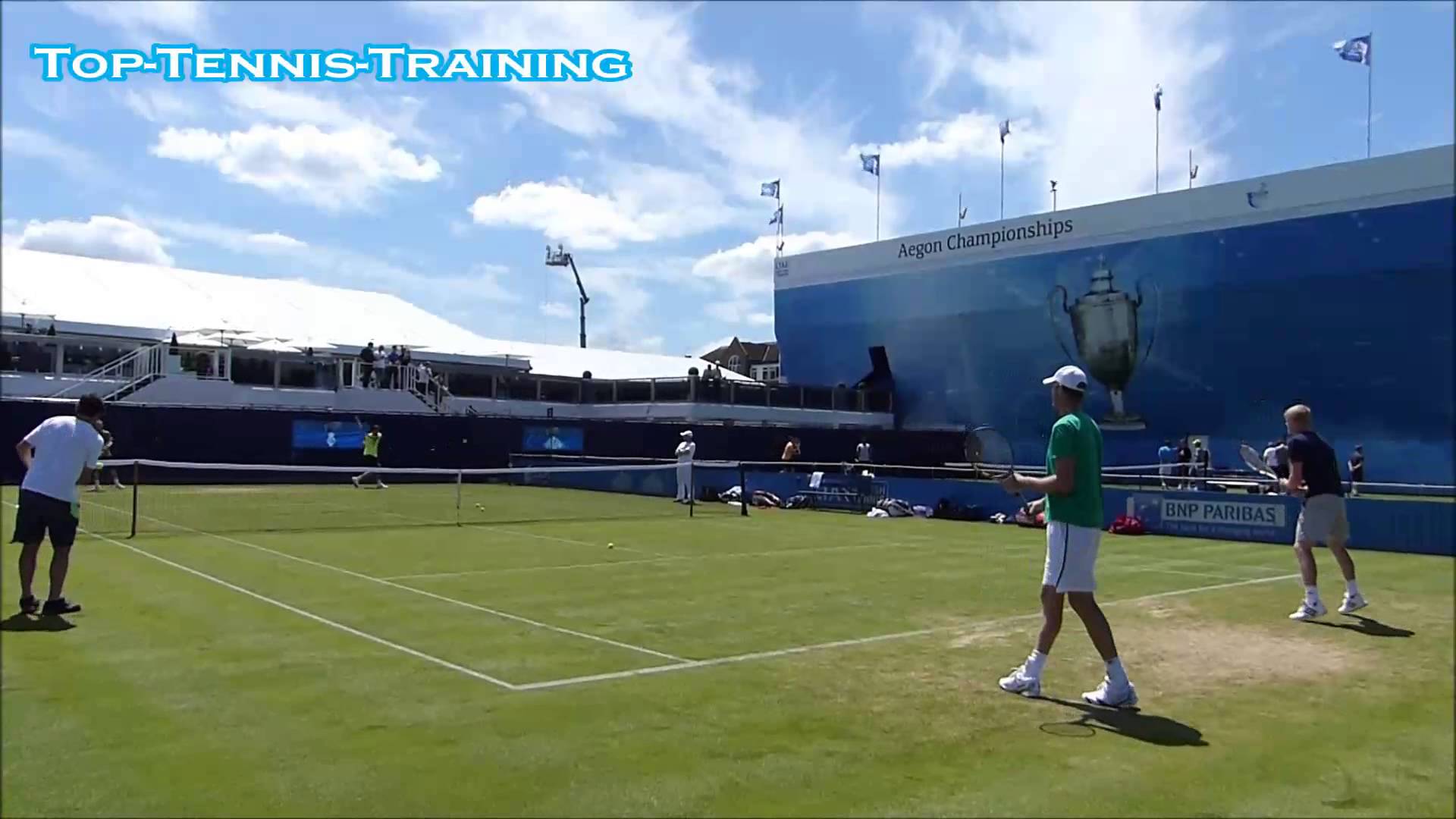 Marin Cilic hitting with Kyle Edmund and Sam Querrey sharing a court with them in London, June 2014.