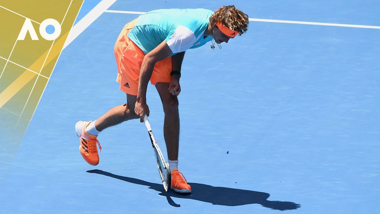 Alexander Zverev`s frustration shows as he smashes his racquet and subsequently gets warned by the umpire.